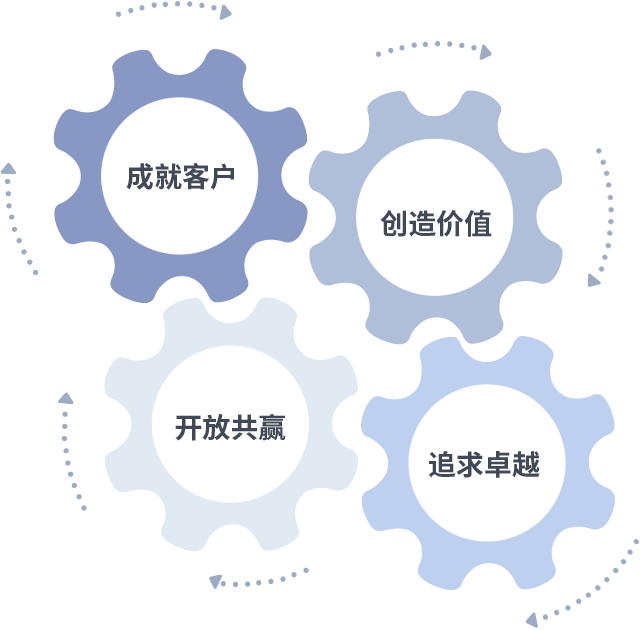 成就客户是一切决策的出发点,创造价值是衡量所有工作的标准,追求卓越是918博天娱乐做事做人的态度,开放共赢是918博天娱乐的格局也是最终的结果。价值观的齿轮环环相扣,推动着组织里的每个人不断向前。